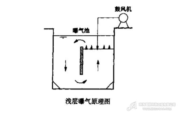 淺層低壓曝氣又名因卡曝氣(INKA aeration),是瑞典ka公司所開發(fā)的,其原理基于氣泡在剛剛形成的瞬息間,其吸氧率最高。如圖所示。曝氣設(shè)備裝在距液面800~900mm處,可采用低壓風(fēng)機(jī)。單位輸入能量的相對吸氧量可達(dá)最大,它可充分發(fā)揮曝氣設(shè)備的能力。風(fēng)機(jī)的風(fēng)壓約1000mm左右即可滿足要求。池中間設(shè)置縱向隔板,以利液流循環(huán),充氧能力可達(dá)1.80~2.60kg/(kW.h)。工藝缺點(diǎn)是曝氣柵管孔眼易堵塞。