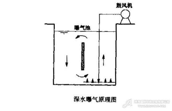 曝氣池內(nèi)水深可達(dá)8.5~30m,由于水壓較大,故氧利用率較高;但需要的供風(fēng)壓力較大,因此動(dòng)力消耗并不節(jié)省。近年來發(fā)展了若干種類的深水曝氣池,主要有深水底層曝氣、深水中層曝氣,其中包括單側(cè)旋流式、雙側(cè)旋流式、完全混合式等。為了減小風(fēng)壓,曝氣器往往裝在池深的一半,形成液―氣流的循環(huán),可節(jié)省能耗。當(dāng)水深超過10~30m時(shí),即為塔式曝氣池。見下圖