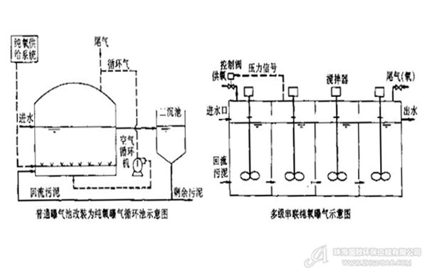 (1)空氣中含氧一般為21%,一般純氧中含氧為90%~95%,而氧的分壓純氧比空氣高4.4~4.7倍,因此純氧曝氣能大大提高氧在混合液中的擴(kuò)散能力;